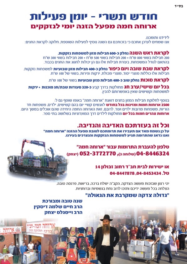 גם השנה, כחלק מפעילותה בחודש תשרי, ארוחה חמה קרית אתא חילקה מעל 600 סלי מזון לאנשים נזקקים בקרית אתא.